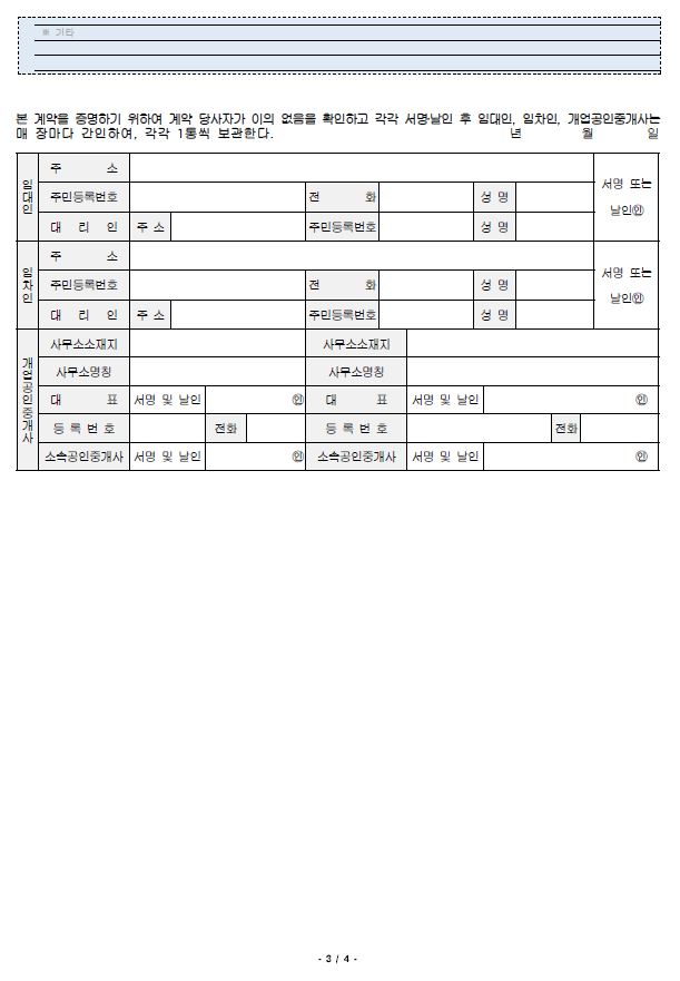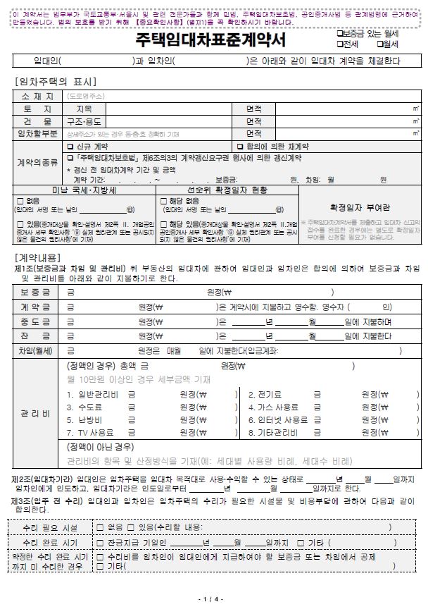 말그대로 표준임대차계약서 서식이기 때문에, 표준화된 양식의 빈칸에 내용들을 채워넣으시면 됩니다. 서식을 다운 받으시면 계약의 종류, 임차 주택의 정보, 계약 내용, 임차인·임대인의 정보 등을 기재할 수 있게 되어있습니다. 대다수의 사람들이 부동산에서 중개인과 함께 계약서를 작성하시겠지만, 계약서 상의 내용을 숙지하고 계약을 하는 것과 그렇지 않은 것은 하늘과 땅 차이이므로, 계약 전 반드시 표준임대차계약서 상의 내용을 숙지하시기 바랍니다.